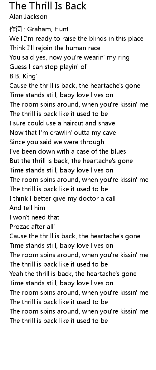 | Yeah the thrill is back, the heartache' s gone | |