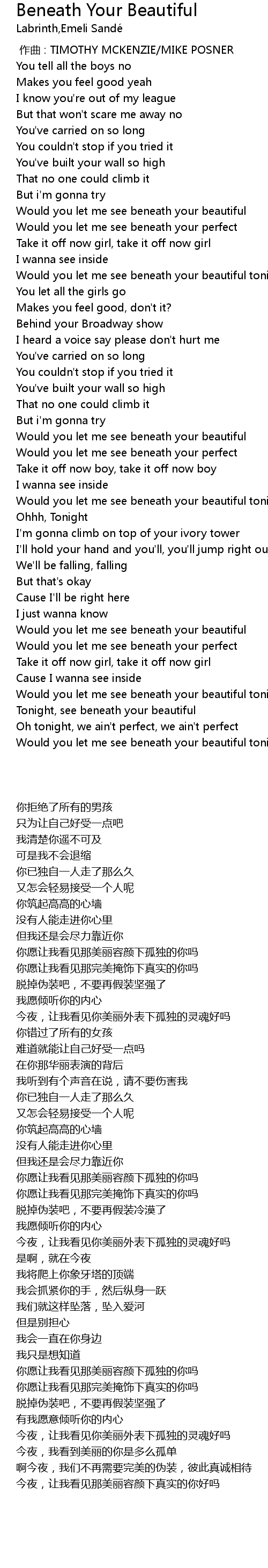 | [01:13.400] | Would you let me see beneath your beautiful tonight |