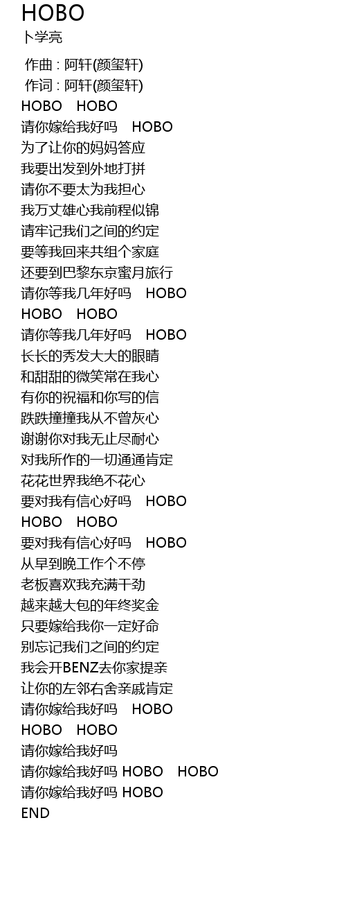 | [02:58.14] | 请你嫁给我好吗 HOBO HOBO |