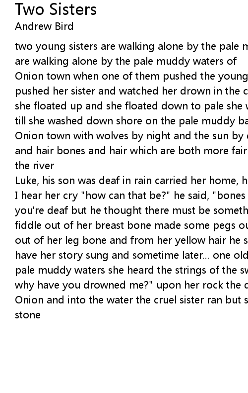 I hear her cry "how can that be?" he said, "bones don't cry" he said besides you're deaf but he thought there must be something to these bones so he made a fiddle out of her breast bone made some pegs out of her finger bone made a bow out of her leg bone and from her yellow hair he strum the strings that would have her story sung and sometime later... one old woman was walking alone by the pale muddy waters she heard the strings of the sweet fiddle cry "Cruel sister, why have you drowned me?" upon her rock the deaf boy played oh the bows of |