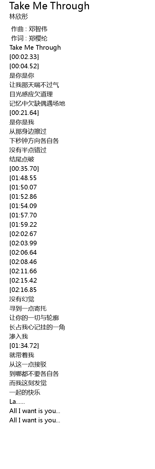 | [02:59.83][02:02.67][00:50.95] | Take me through |