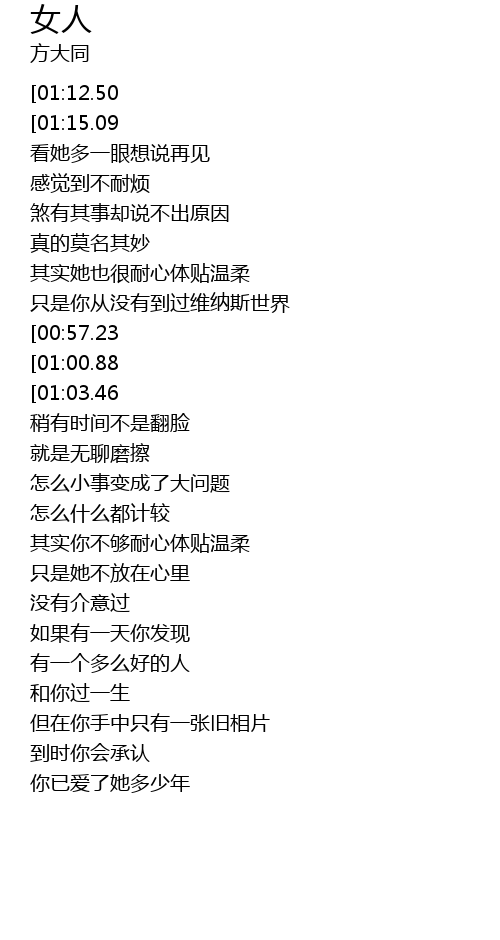 | [00:47.10][00:57.23][01:38.60][01:48.55][02:19.90][02:29.88][02:40.20][02:50.41] | 你你要对你的女人好 |