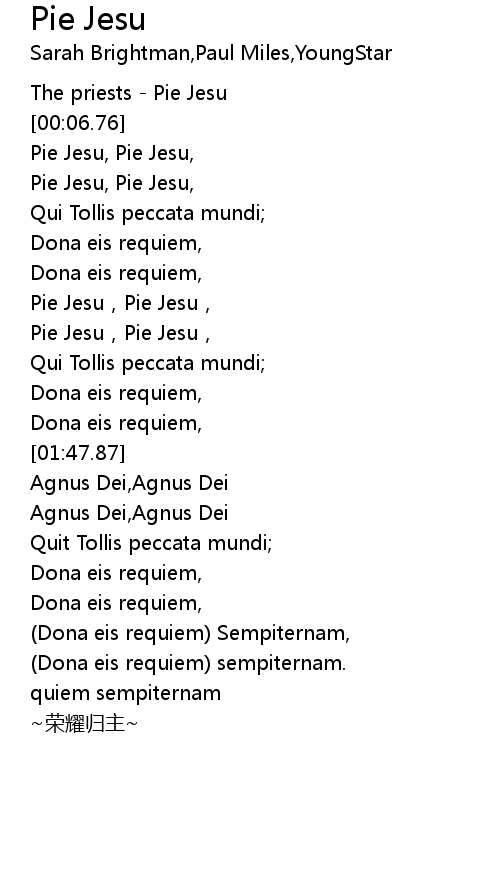 | [00:15.43] | Pie Jesu, Pie Jesu, |