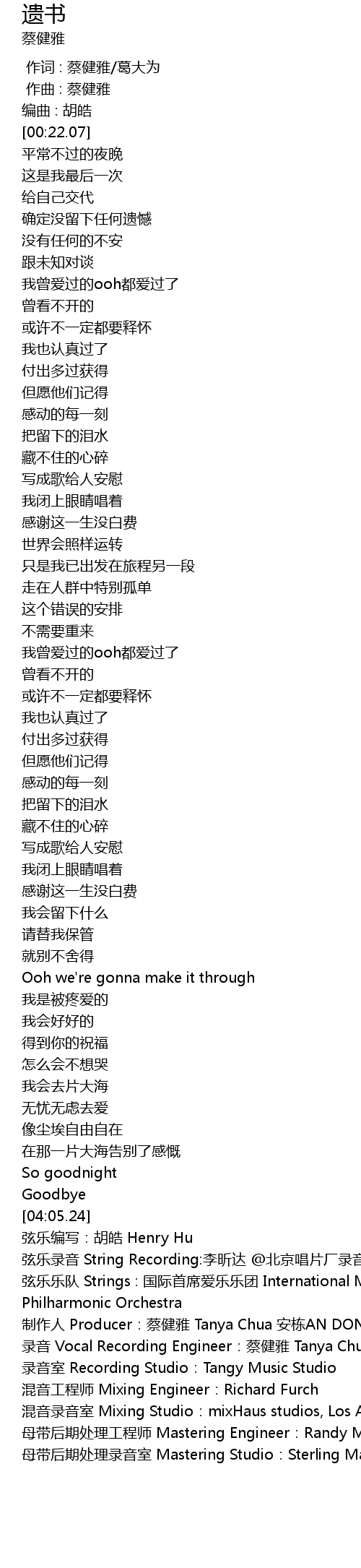 | [04:09.24] | 录音 Vocal Recording Engineer:蔡健雅 Tanya Chua |