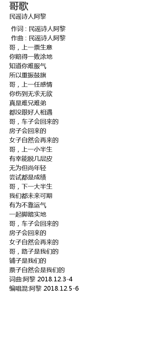 | [00:00.000] | 作词 : 民谣诗人阿黎 |