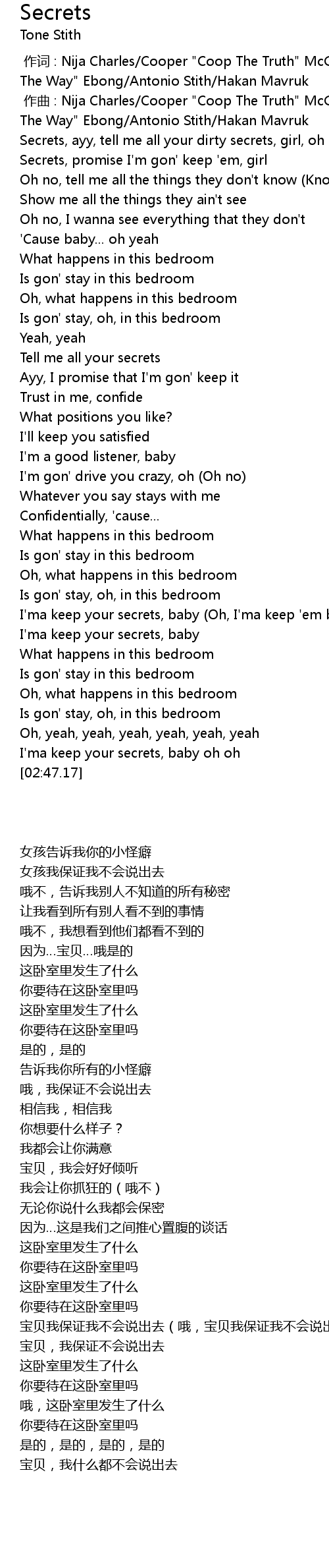 | [02:10.51] | I'ma keep your secrets, baby (Oh, I'ma keep 'em baby) |