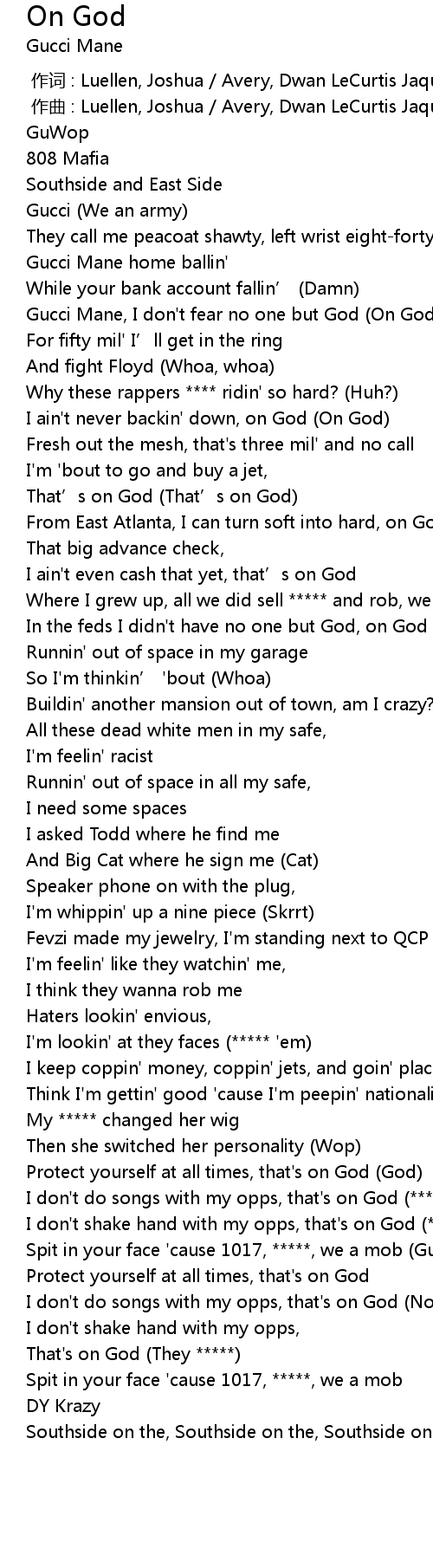 | [00:17.63] | Gucci Mane, I don't fear no one but God (On God) |
