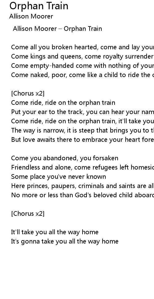 | Come ride, ride on the orphan train, it'll take you all the way home | |