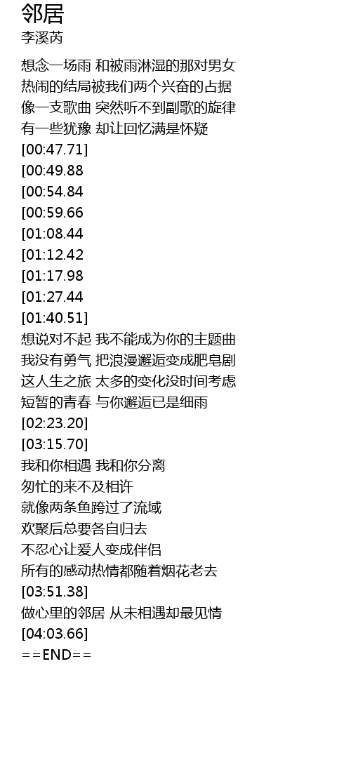 | [03:53.67] | 做心里的邻居 从未相遇却最见情 |
