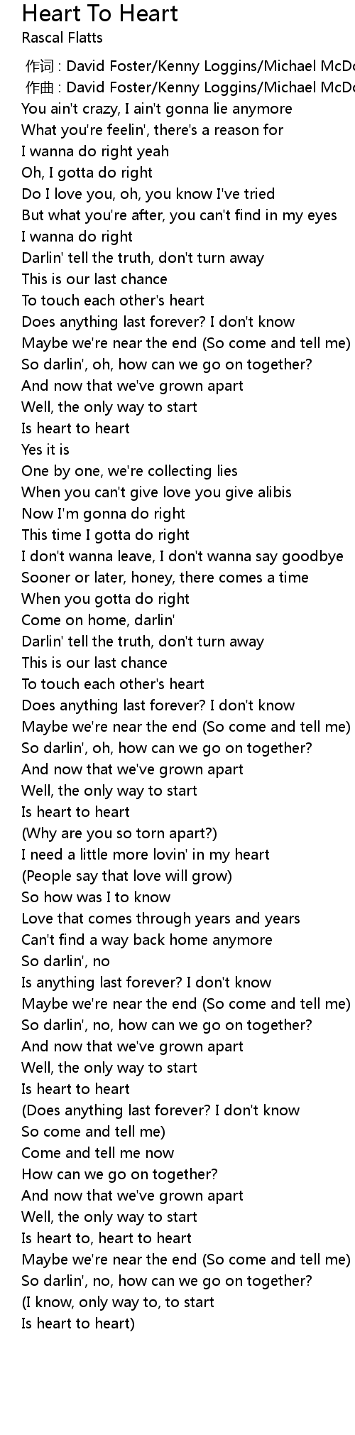 | [04:26.357] | Is heart to, heart to heart |