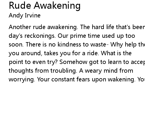 | Another rude awakening. The hard life that's been our school. More of a cruel day's reckonings. Our prime time used up too | |