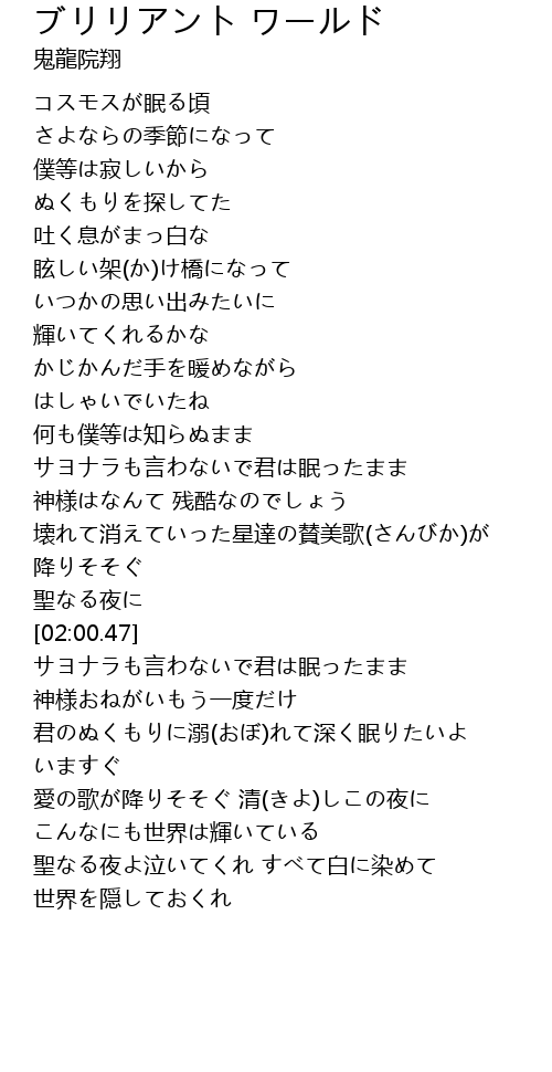 | [03:47.30] | 聖なる夜よ泣いてくれ すべて白に染めて |