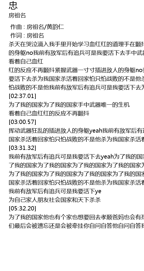 | [03:32.21] | 我前有敌军后有追兵可是我要活下去yeah为了我的国家为了我的国家宁死不屈为 |