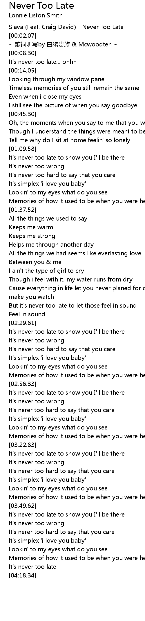 | [00:01.40] | Slava Feat. Craig David Never Too Late |