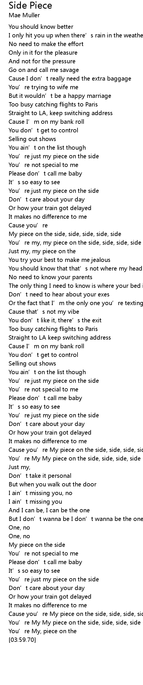 | [00:46.43] | You’re just my piece on the side |