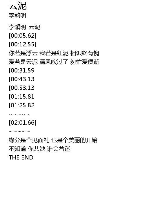 | [00:11.34] | 你若是浮云 我若是红泥 相识终有愧 |