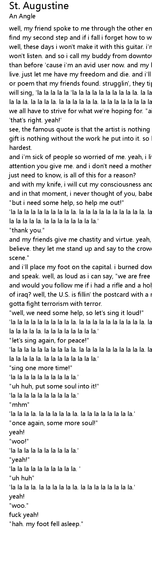 well, these days i won't make it with this guitar. i'm talking to it but it just won't listen. and so i call my buddy from downtown. he makes his cuts better than before 'cause i'm an avid user now. and my brother, i have no obligation to live. just let me have my freedom and die. and i'll come back stronger in a song or poem that my friends found. strugglin', they tip their glasses back and they will sing, 'la la la la la 'la la la la la la la la la la. la la la la la la la la la la. la la la la. la la la la la la. la la la la la la la la.' |