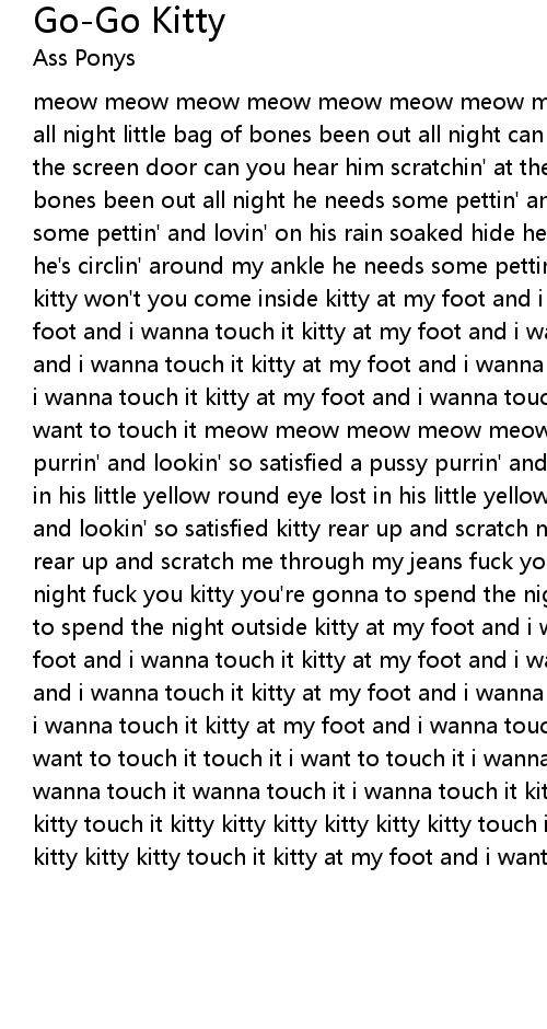 meow meow meow meow meow meow meow meow meow meow little bag of bones been out all night little bag of bones been out all night can you hear him scratchin' at the screen door can you hear him scratchin' at the screen door little bag a bones been out all night he needs some pettin' and lovin' on his head he needs some pettin' and lovin' on his rain soaked hide he's circlin' around my ankle he's circlin' around my ankle he needs some pettin' and lovin' on his hide hey kitty won't you come inside kitty at my foot and i wanna touch it kitty at my foot and i wanna touch it kitty at my foot and i wanna touch it kitty at my foot and i wanna touch it kitty at my foot and i wanna touch it kitty at my foot and i wanna touch it kitty at my foot and i wanna touch it kitty at my foot and i want to touch it meow meow meow meow meow meow meow meow meow meow a pussy purrin' and lookin' so satisfied a pussy purrin' and lookin' so satisfied lost in his little yellow round eye lost in his little yellow round eye pussy purrin' and lookin' so satisfied kitty rear up and scratch me through my jeans kitty rear up and scratch me through my jeans fuck you kitty you're gonna to spend the night fuck you kitty you're gonna to spend the night fuck you kitty you're gonna to spend the night outside kitty at my foot and i wanna touch it kitty at my foot and i wanna touch it kitty at my foot and i wanna touch it kitty at my foot and i wanna touch it kitty at my foot and i wanna touch it kitty at my foot and i wanna touch it kitty at my foot and i wanna touch it kitty at my foot and i want to touch it touch it i want to touch it i wanna touch it i wanna touch it i wanna touch it wanna touch it i wanna touch it kitty kitty kitty kitty kitty kitty touch it kitty kitty kitty kitty kitty kitty touch it kitty kitty kitty kitty kitty kitty touch it kitty at my foot and i want to touch it