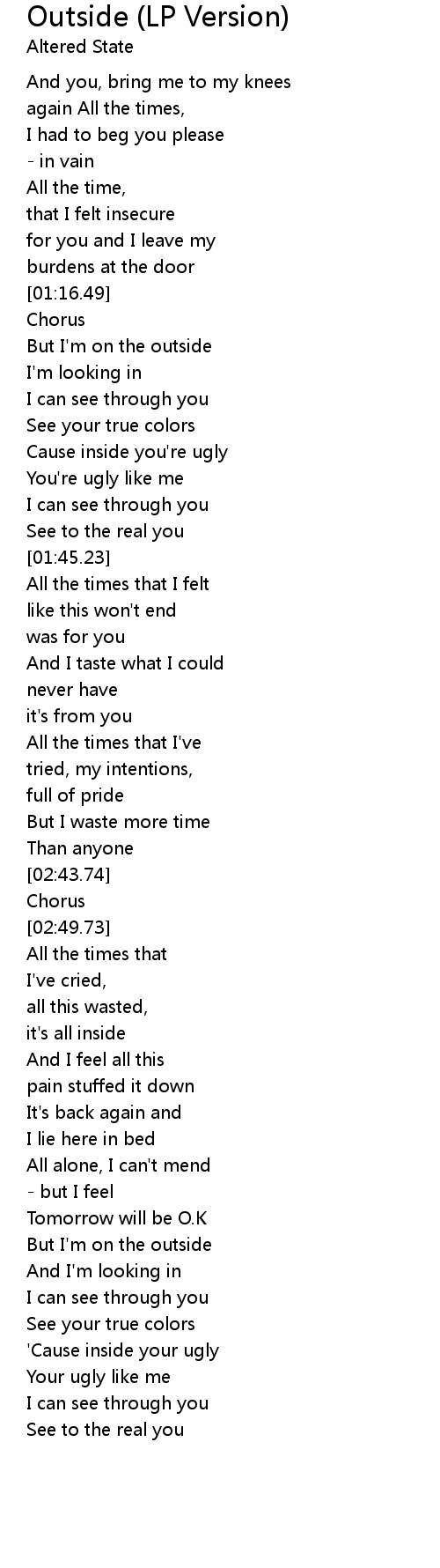 | [01:20.26] | But I'm on the outside |