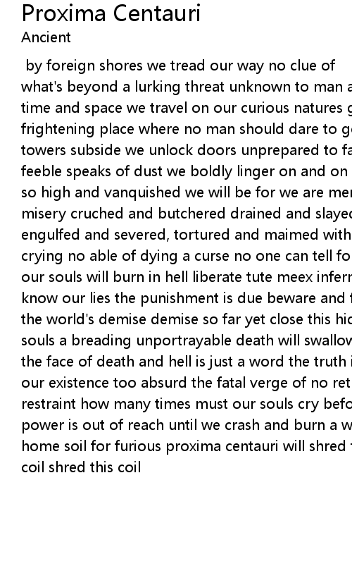 [Music: Aphazel - Lyrics: GroM] by foreign shores we tread our way no clue of what's beyond a lurking threat unknown to man an ancient force of prey through time and space we travel on our curious natures grow an evil dark and frightening place where no man should dare to go ave aquevale for the neptune towers subside we unlock doors unprepared to face the horrors far beyond as feeble speaks of dust we boldly linger on and on our souls will burn with flames so high and vanquished we will be for we are merely strangers in this void of misery cruched and butchered drained and slayed our souls forever scream engulfed and severed, tortured and maimed with no hope to be free anghuishly crying no able of dying a curse no one can tell forever standed and abandoned our souls will burn in hell liberate tute meex infernis we hear our cries we know our lies the punishment is due beware and fear that which is near and face the world's demise demise so far yet close this hidden evil a scythe reaping souls a breading unportrayable death will swallow all mankind we have not seen the face of death and hell is just a word the truth is far much worse and vile our existence too absurd the fatal verge of no return now breached beyond restraint how many times must our souls cry before we finally learn we face what power is out of reach until we crash and burn a warning's given us remain on our home soil for furious proxima centauri will shred this mortal coil shred this coil shred this coil