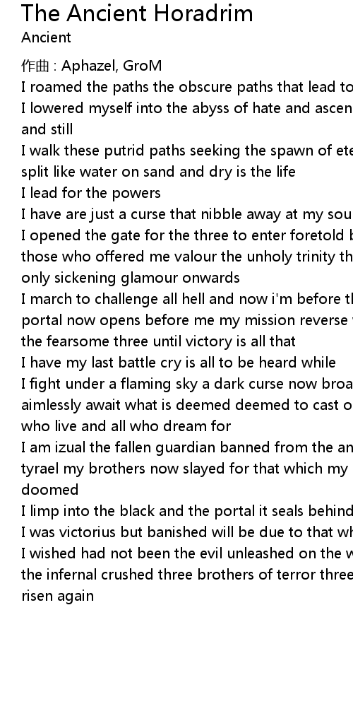| I march to challenge all hell and now i' m before the last seal the red misty portal now opens before me my mission reverse what i' ve done and face the three the fearsome three until victory is all that | |