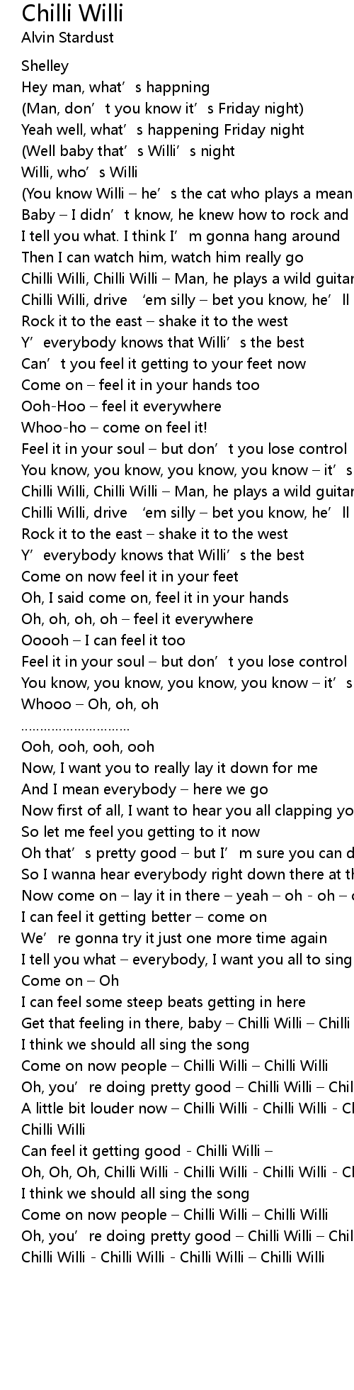 | A little bit louder now Chilli Willi Chilli Willi Chilli Willi whoa Chilli Willi | |