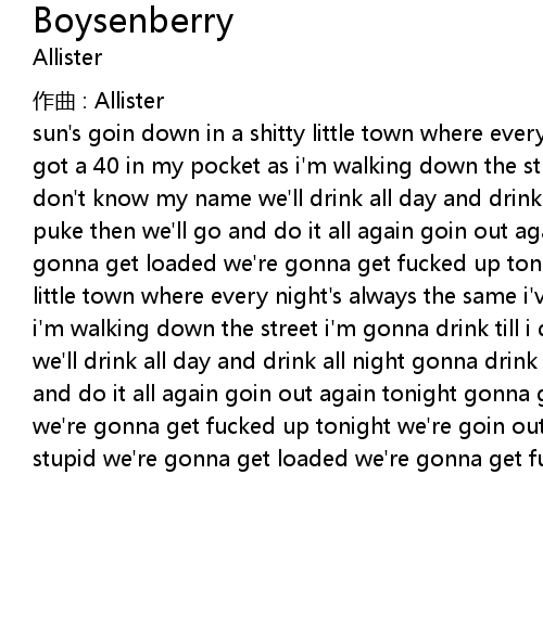 | sun' s goin down in a shitty little town where every night' s always the same i' ve got a 40 in my pocket as i' m walking down the street i' m gonna drink till i don' t know my name we' ll drink all day and drink all night gonna drink until we puke then we' ll go and do it all again goin out again tonight gonna get stupid gonna get loaded we' re gonna get fucked up tonight sun' s goin down in a shitty little town where every night' s always the same i' ve got a 40 in my pocket as i' m walking down the street i' m gonna drink till i don' t know my name i said we' ll drink all day and drink all night gonna drink until we puke then we' ll go and do it all again goin out again tonight gonna get stupid gonna get loaded we' re gonna get fucked up tonight we' re goin out again tonight we' re gonna get stupid we' re gonna get loaded we' re gonna get fucked up tonight |