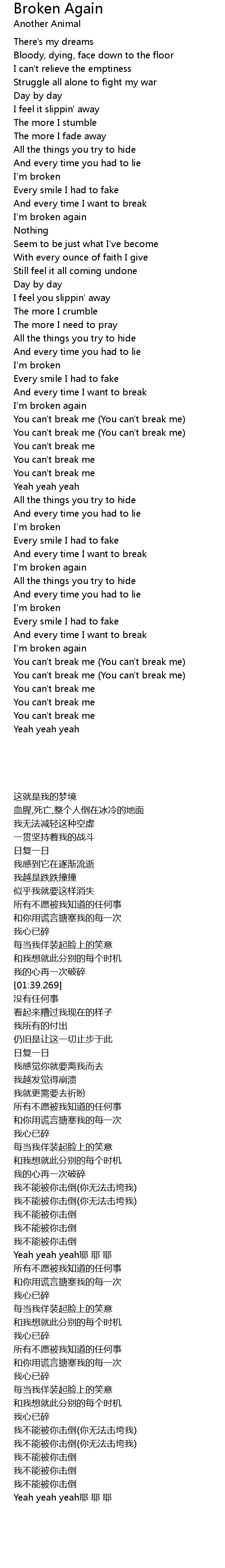 | [04:49.732] | 我不能被你击倒(你无法击垮我) |