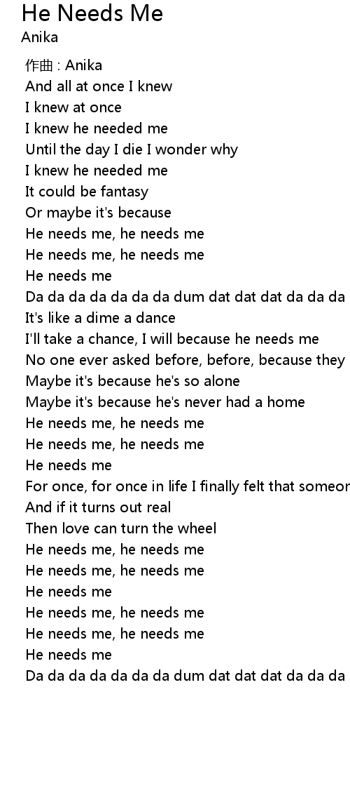 | [01:05.082] | I'll take a chance, I will because he needs me |