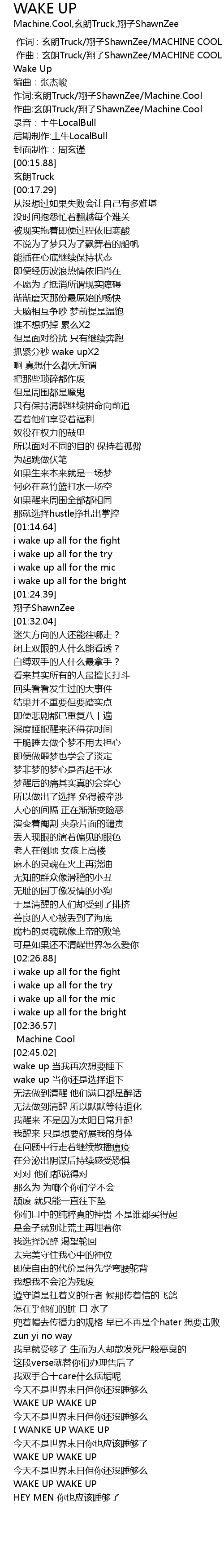 | [00:05.85] | 作词:玄朗Truck/翔子ShawnZee/Machine.Cool |