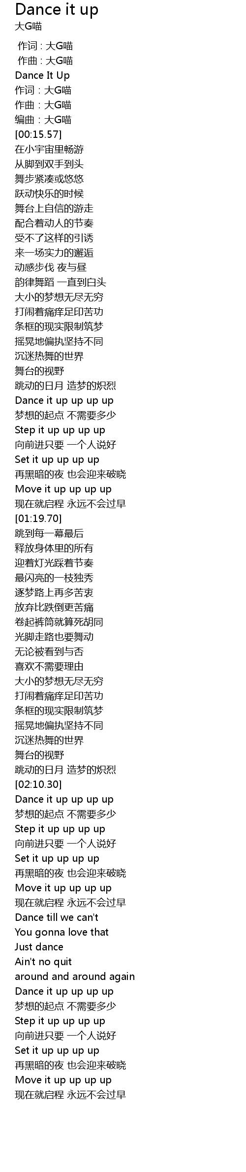 | [02:10.64] | Dance it up up up up |