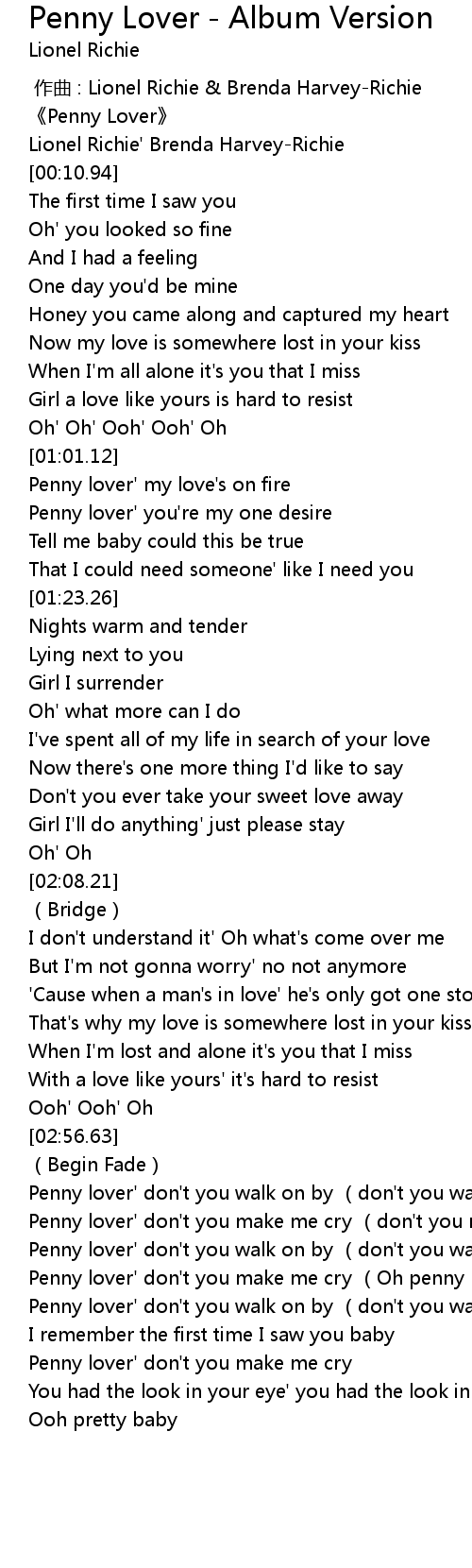 | [03:17.38] | Penny lover' don't you walk on by (don't you walk on by) |