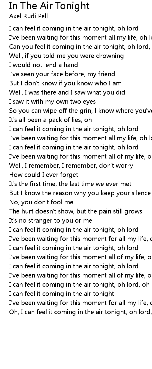 I can feel it coming in the air tonight, oh lord, oh lord, ohhh |
