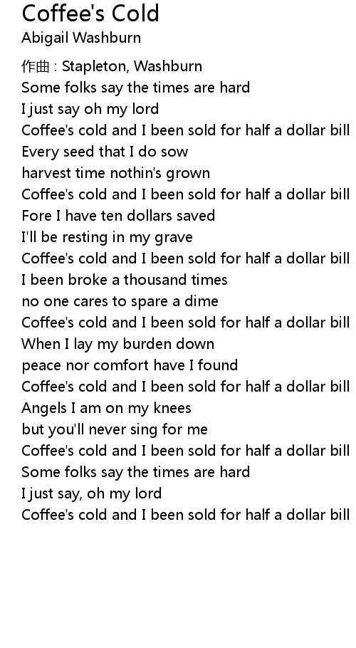 | Coffee' s cold and I been sold for half a dollar bill | |