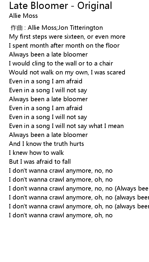 | [03:39.75] | I don't wanna crawl anymore, oh, no (always been a late bloomer) |