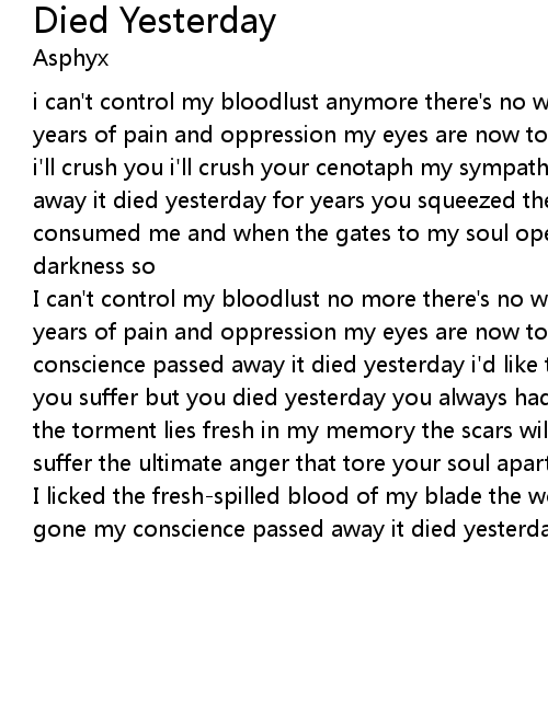 | I can't control my bloodlust no more there's no way back for you after all these years of pain and oppression my eyes are now to see my sympathy is gone my conscience passed away it died yesterday i'd like to see you beg i'd like to see you suffer but you died yesterday you always had me beg you always had me suffer the torment lies fresh in my memory the scars will never heal so you had to suffer the ultimate anger that tore your soul apart and | |