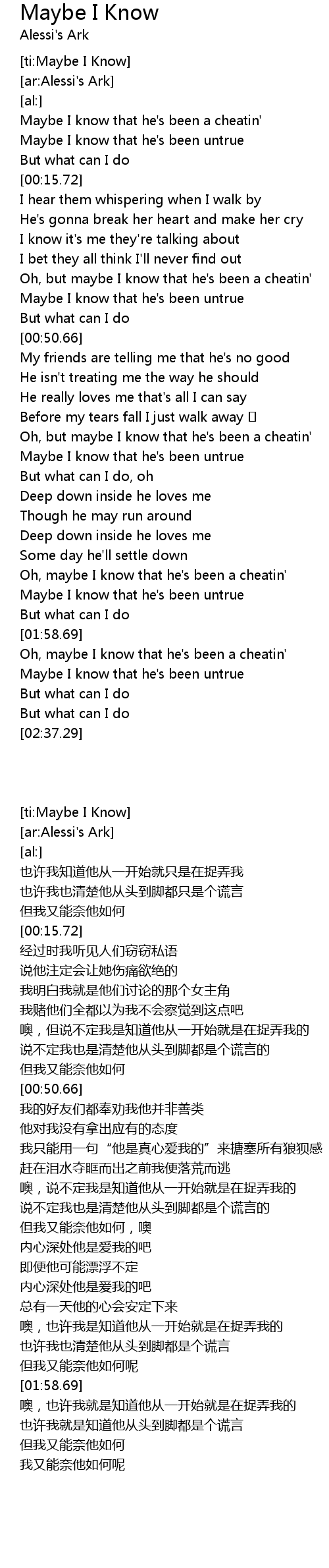 | [00:00.00] | Maybe I know that he' s been a cheatin' |