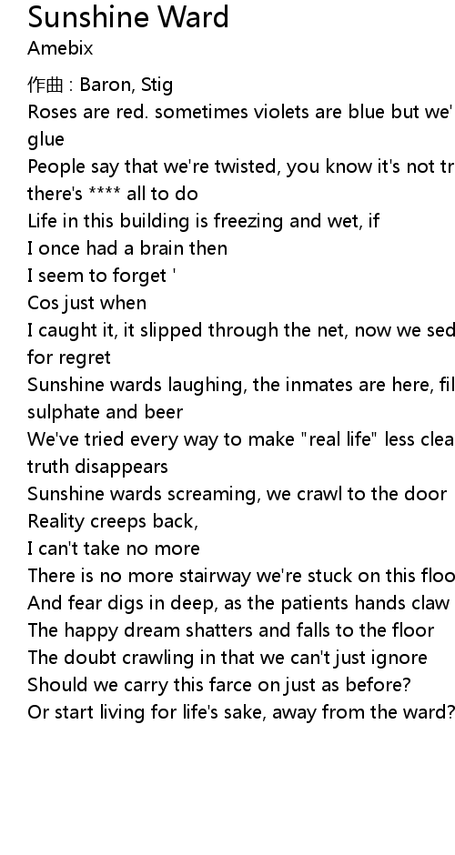 | Sunshine wards laughing, the inmates are here, filling our lives full of sulphate and beer | |