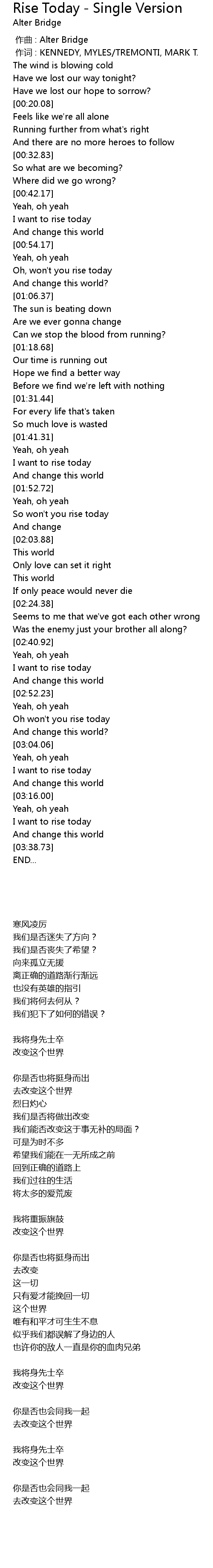 | [00:01.00] | 作词 : KENNEDY, MYLES/TREMONTI, MARK T. |