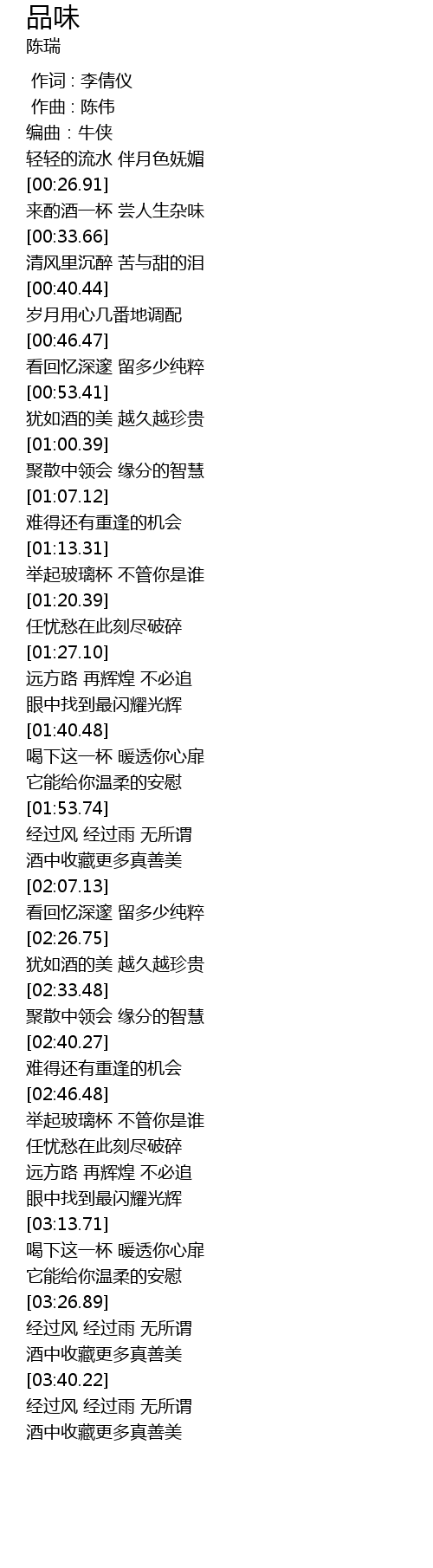 | [00:27.68] | 来酌酒一杯 尝人生杂味 |