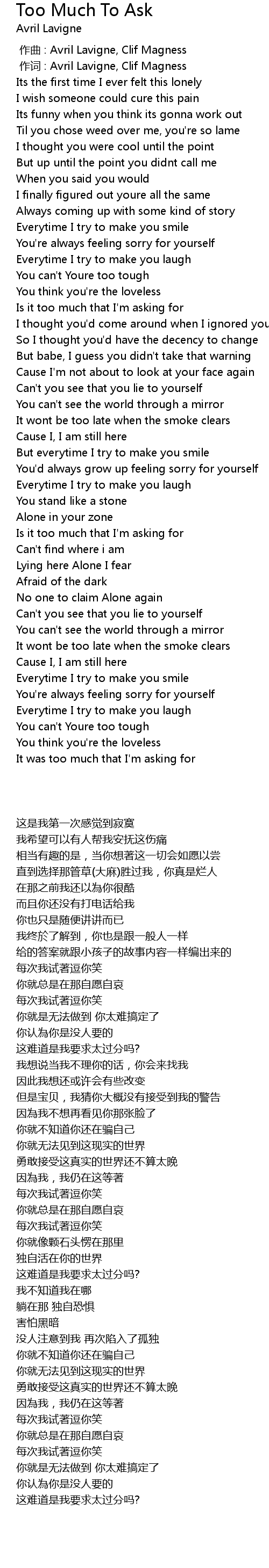 | [00:01.00] | 作词 : Avril Lavigne, Clif Magness |