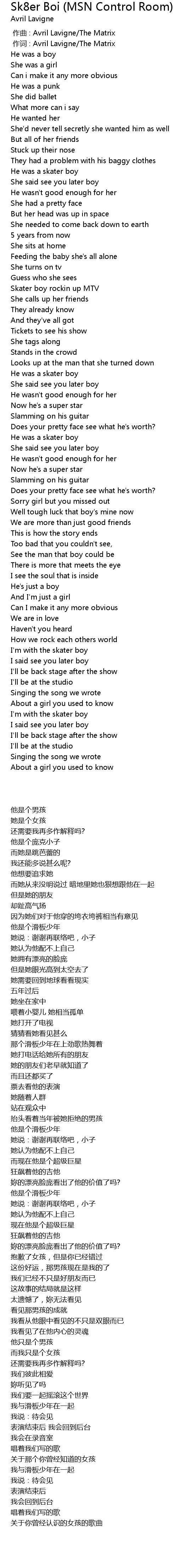 | [00:01.00] | 作词 : Avril Lavigne/The Matrix |