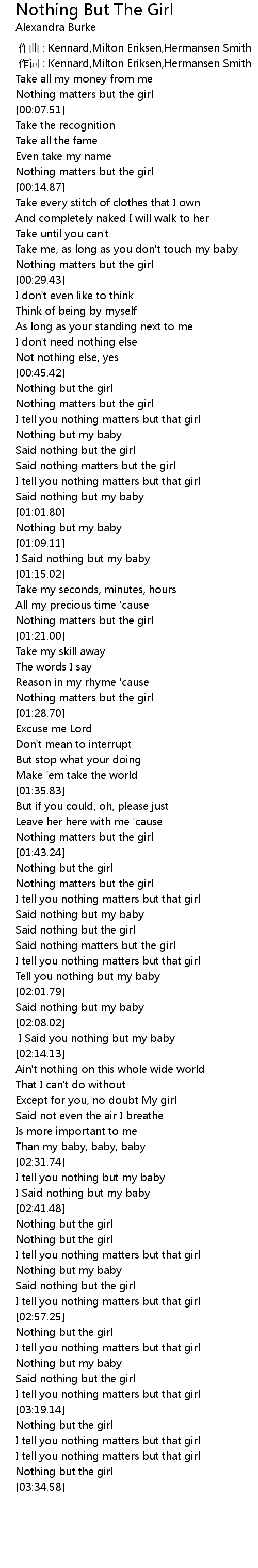 | [03:00.92] | I tell you nothing matters but that girl |