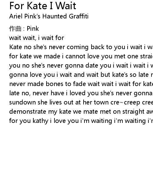 | Kate no she' s never coming back to you i wait i wait for kate i wait demonstrate for kate we made i cannot love you met one straight await the take no i' m a need you no she' s never gonna date you i wait i wait i wait for kate no she' s never gonna love you i wait and wait but kate' s so late no, no pda, the day today i never made bones to fade wait wait i wait for kate i wait i wait but kate' s so late no, never have i loved you she' s never gonna return to you gather at sundown she lives out at her town cre creep creep creep for the first time demonstrate my kate we mate met on straight await the take kathy i' m waiting! for you kathy i love you i' m waiting i' m waiting i' m in love i love you |