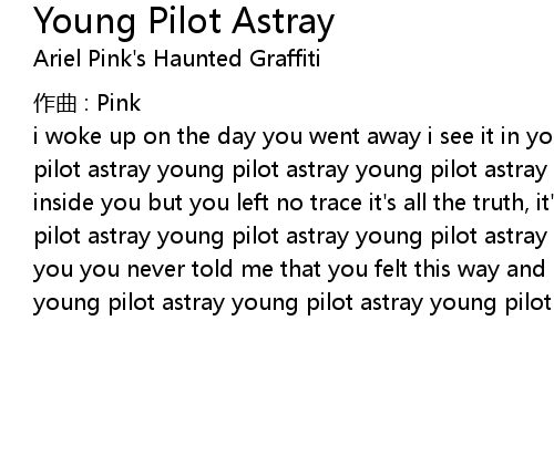 | i woke up on the day you went away i see it in your faces day all wit' s young pilot astray young pilot astray young pilot astray young pilot astray i looked inside you but you left no trace it' s all the truth, it' s not too late young pilot astray young pilot astray young pilot astray young pilot astray i loved you you never told me that you felt this way and i without chokers in the way young pilot astray young pilot astray young pilot astray |
