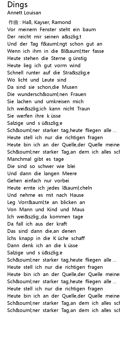 | [02:30.58] | Sch ouml ner starker tag, heute fliegen alle |