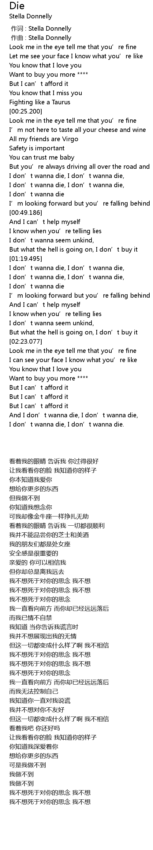 | [00:41.253] | I don' t wanna die, I don' t wanna die, |