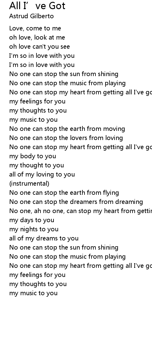 No one can stop my heart from getting all I've got to you |