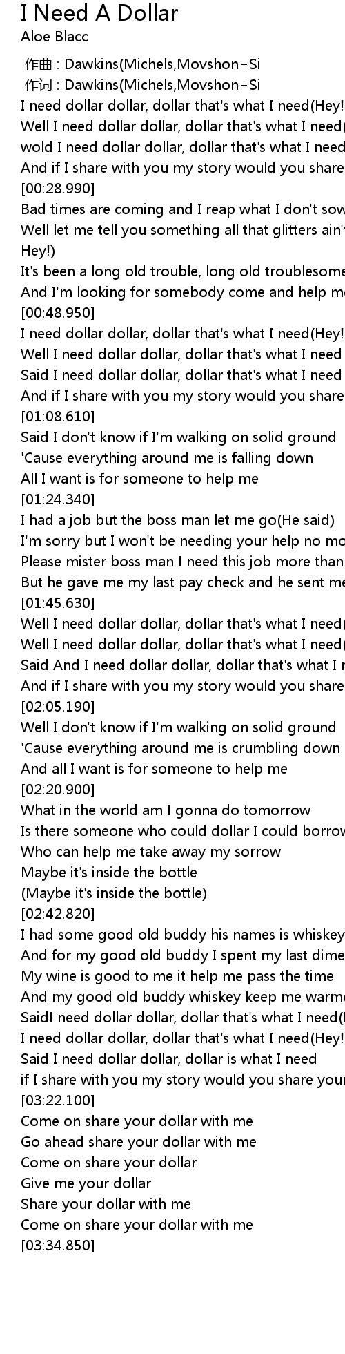 | [03:13.130] | Said I need dollar dollar, dollar is what I need |