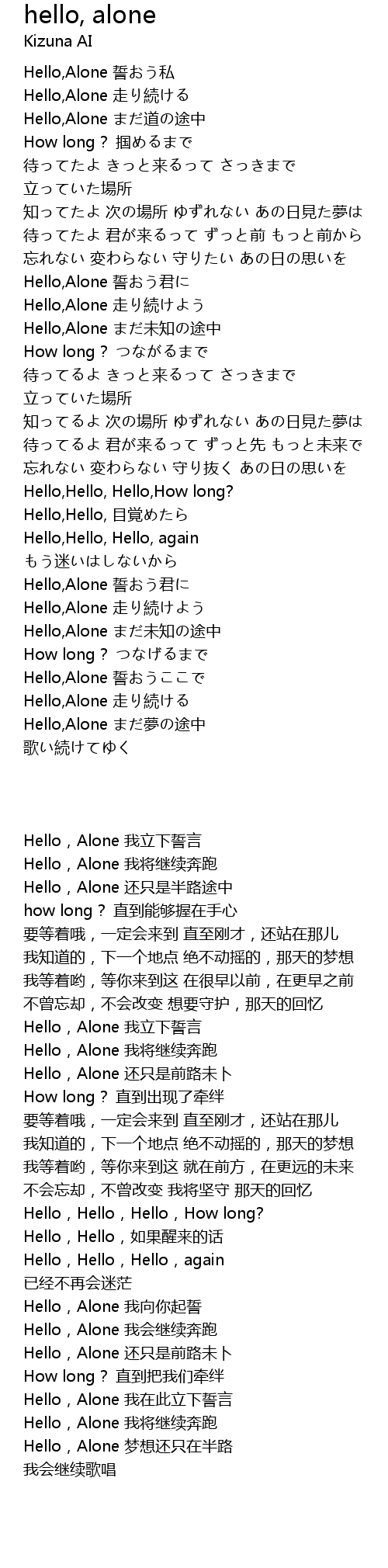 | [00:08.589] | Hello, Alone dào tú zhōng |